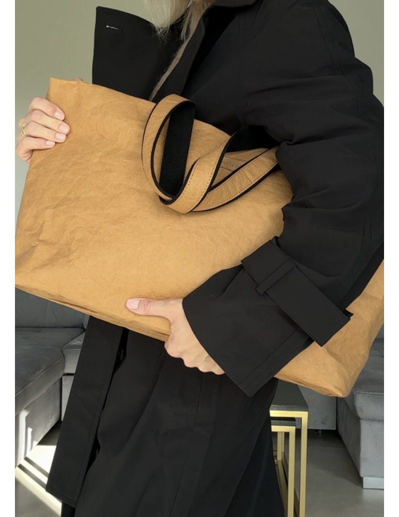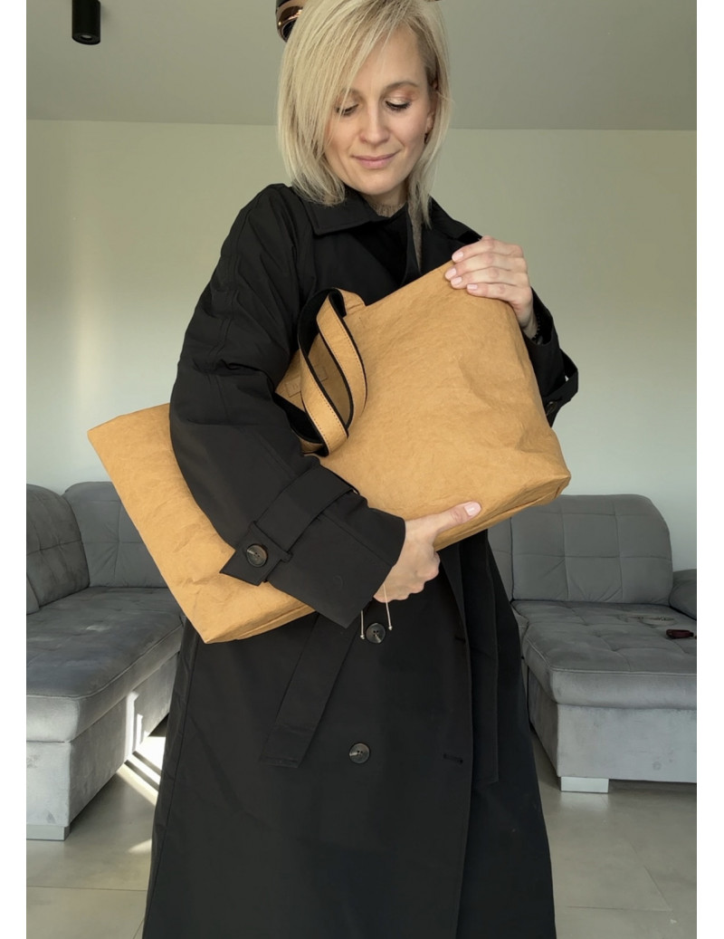 Do czyszczenia torebki nie należy używać środków chemicznych np. rozpuszczalników, benzyny, zmywaczy itp. Załamania i zgięcia są naturalną cechą papieru do szycia. Podczas użytkowania będzie się ona starzała jak skóra i nabierała szlachetności. Każdy arkusz skóry roślinnej na bazie celulozy, ma unikatową fakturę i może mieć niewielkie przebarwienia lub rysy, które wynikają z procesu produkcji i nie są wadą produktu.