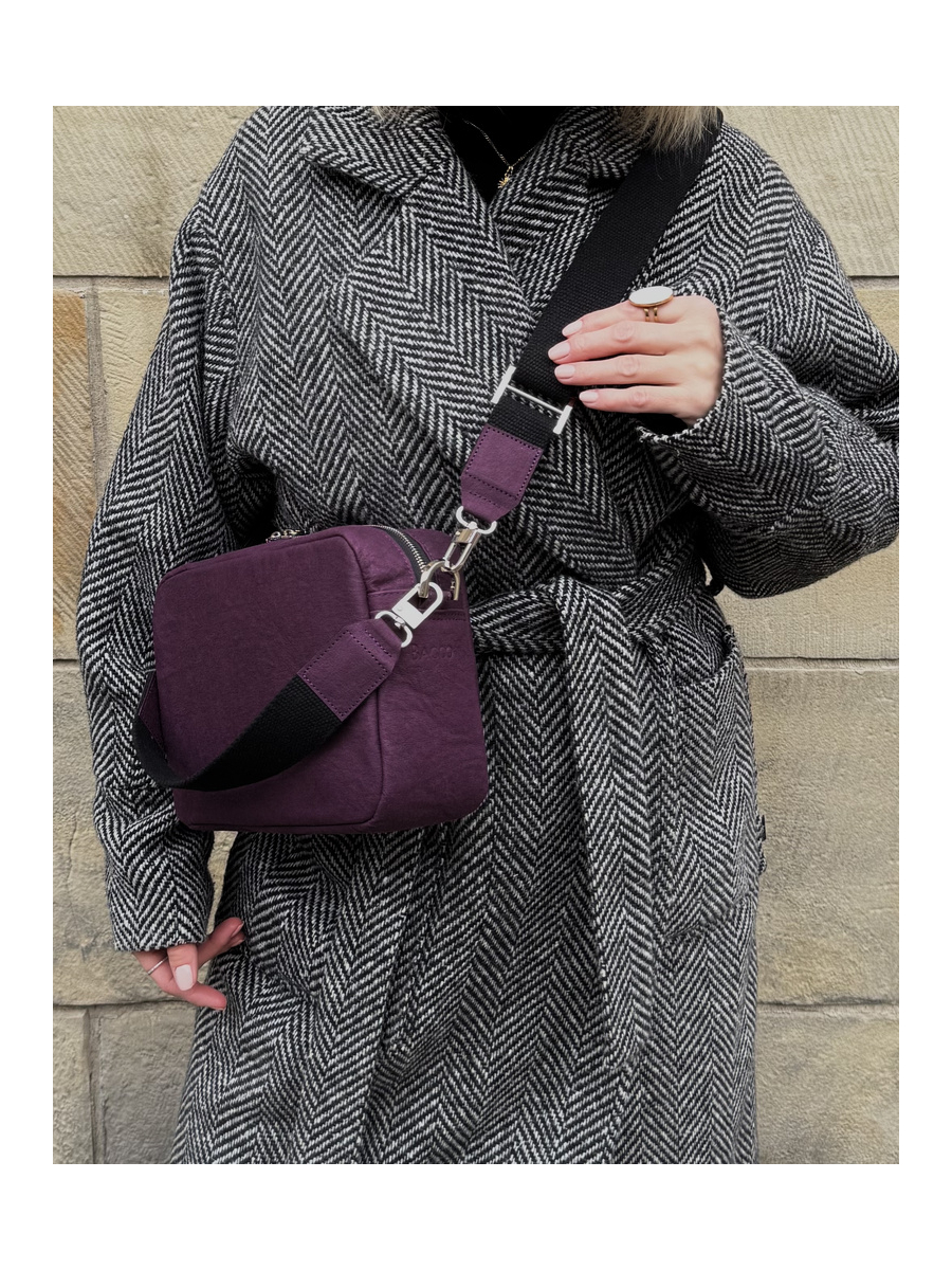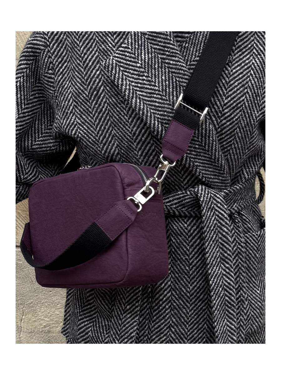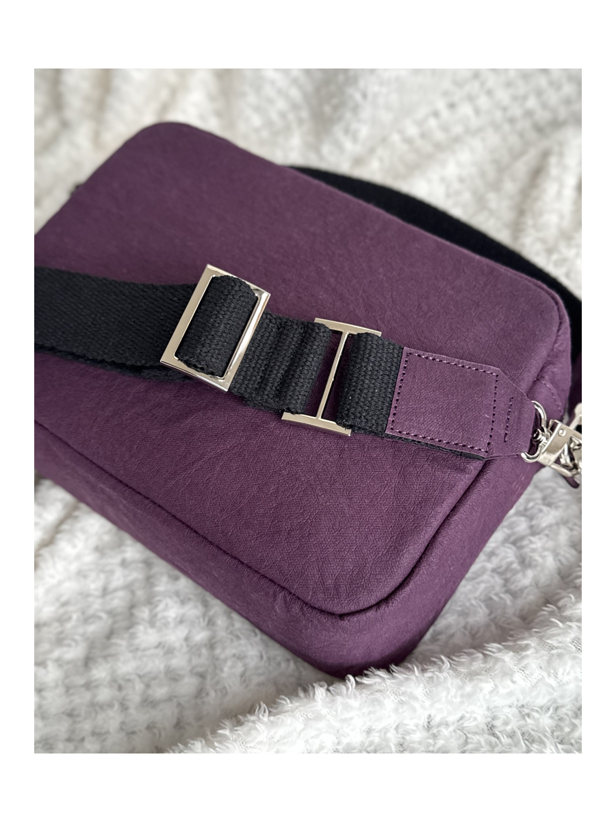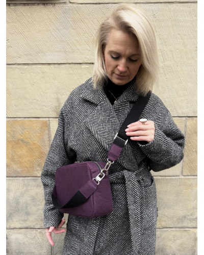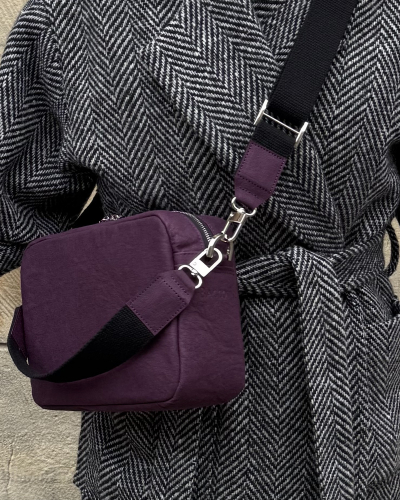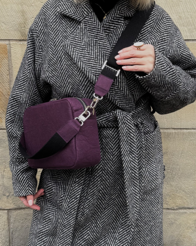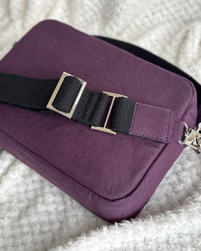 Torebka w kolorze śliwki, paski w kolorze czarnym wykończone śliwką. Okucia srebrne.