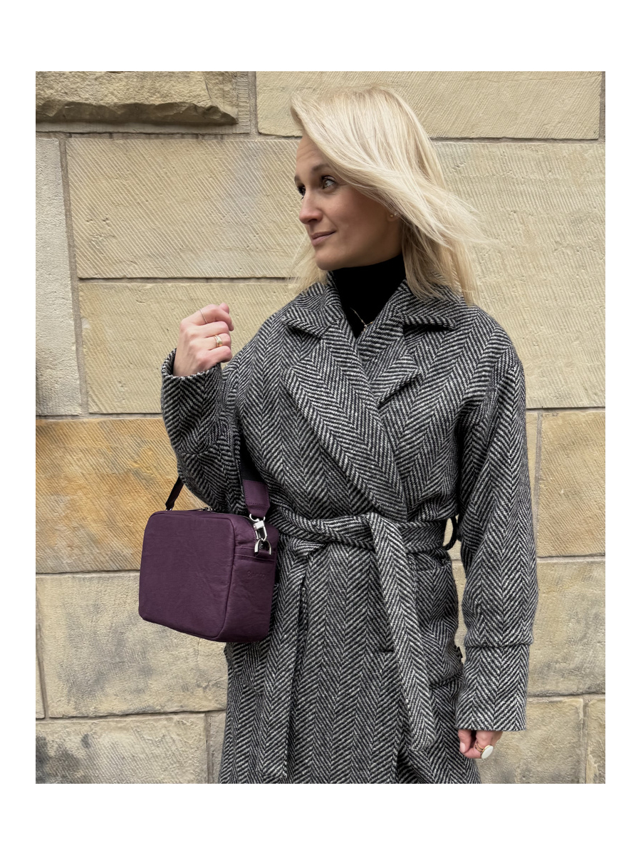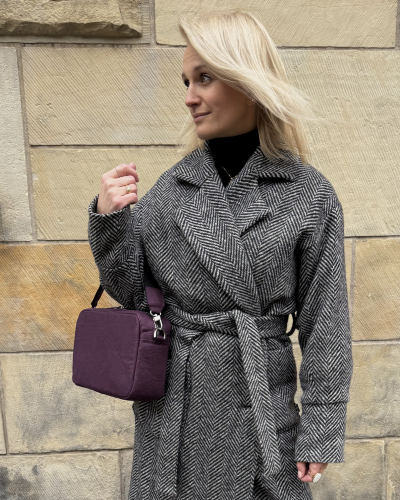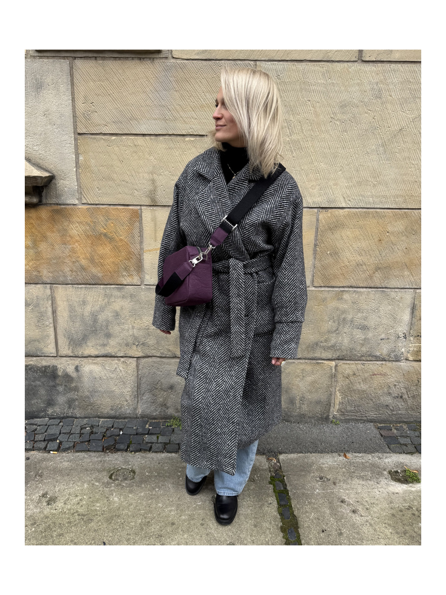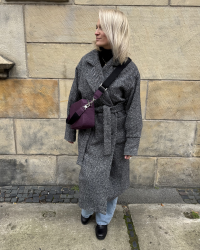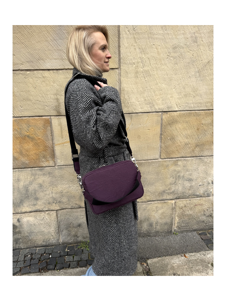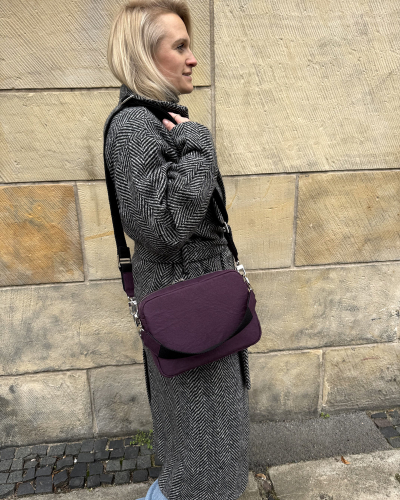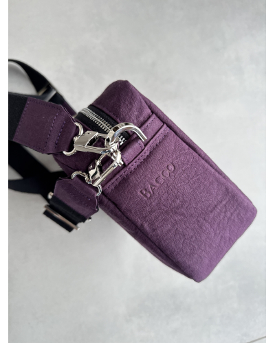 Torebka w kolorze śliwki, paski w kolorze czarnym wykończone śliwką. Okucia srebrne.
