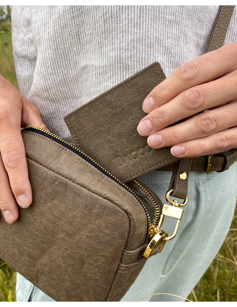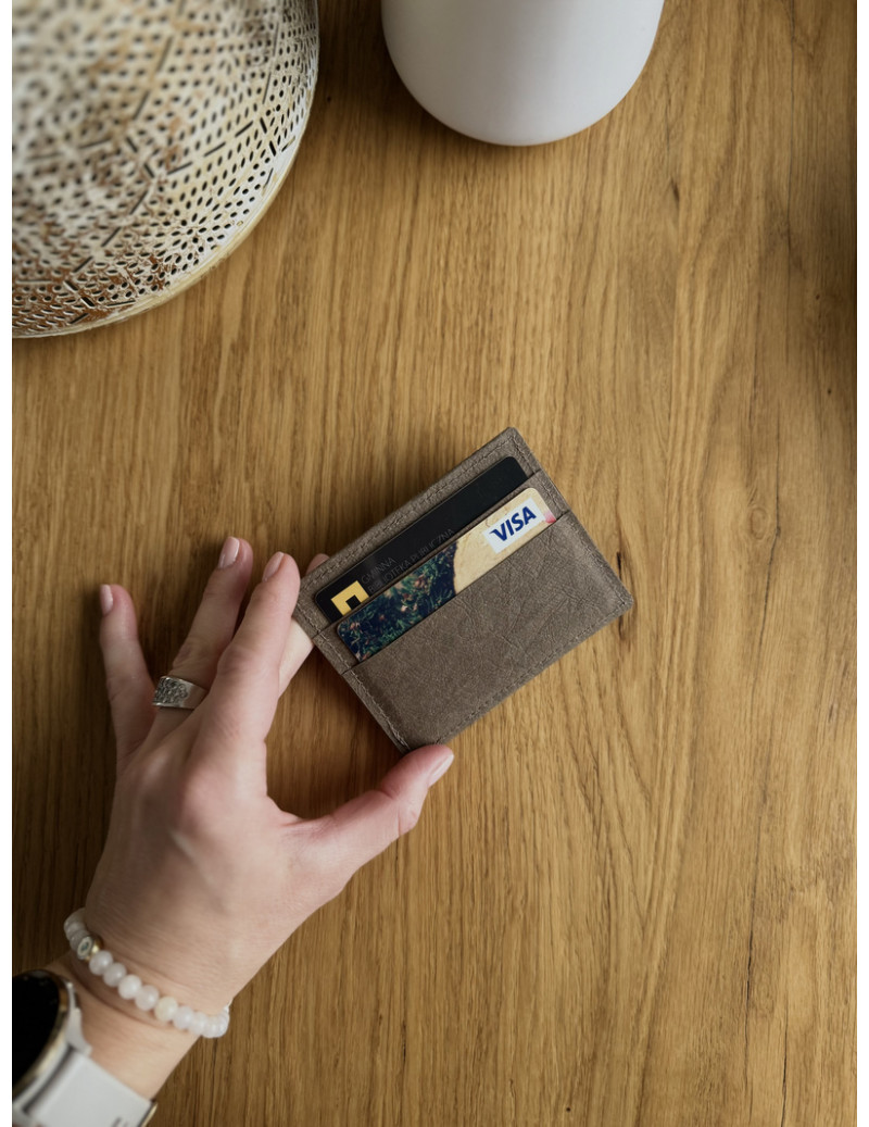 Minimalistyczne etui na karty, które pomieści do czterech kart w stylowy i bezpieczny sposób. Wykonane ze skóry roślinnej, to funkcjonalny dodatek dla osób ceniących porządek i nowoczesny design.