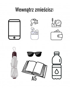 Mieści A5,składany parasol, butelkę 0,5l z wodą.