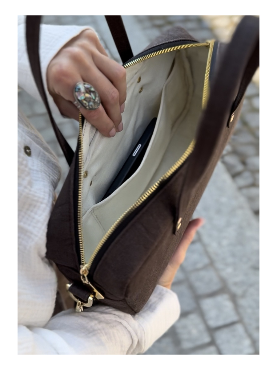 - W przypadku zabrudzenia lnianej podszewki, możesz wyciągnąć ją na zewnątrz torebki (jeżeli model na to pozwala) i delikatnie przeprać, zostawiając do wysuszenia.