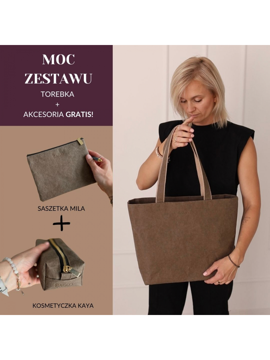 Zestaw 3w1: Shopperka Elly, kosmetyczka i saszetka w cenie torebki - taupe - złote okucia