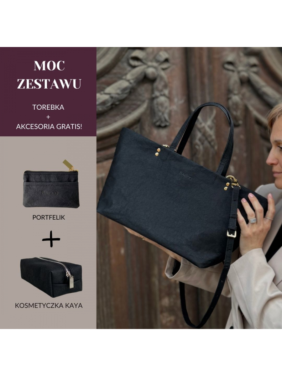 Zestaw 3w1: Shopperka Giulia, kosmetyczka i portfelik w cenie torebki - czarny - złote okucia