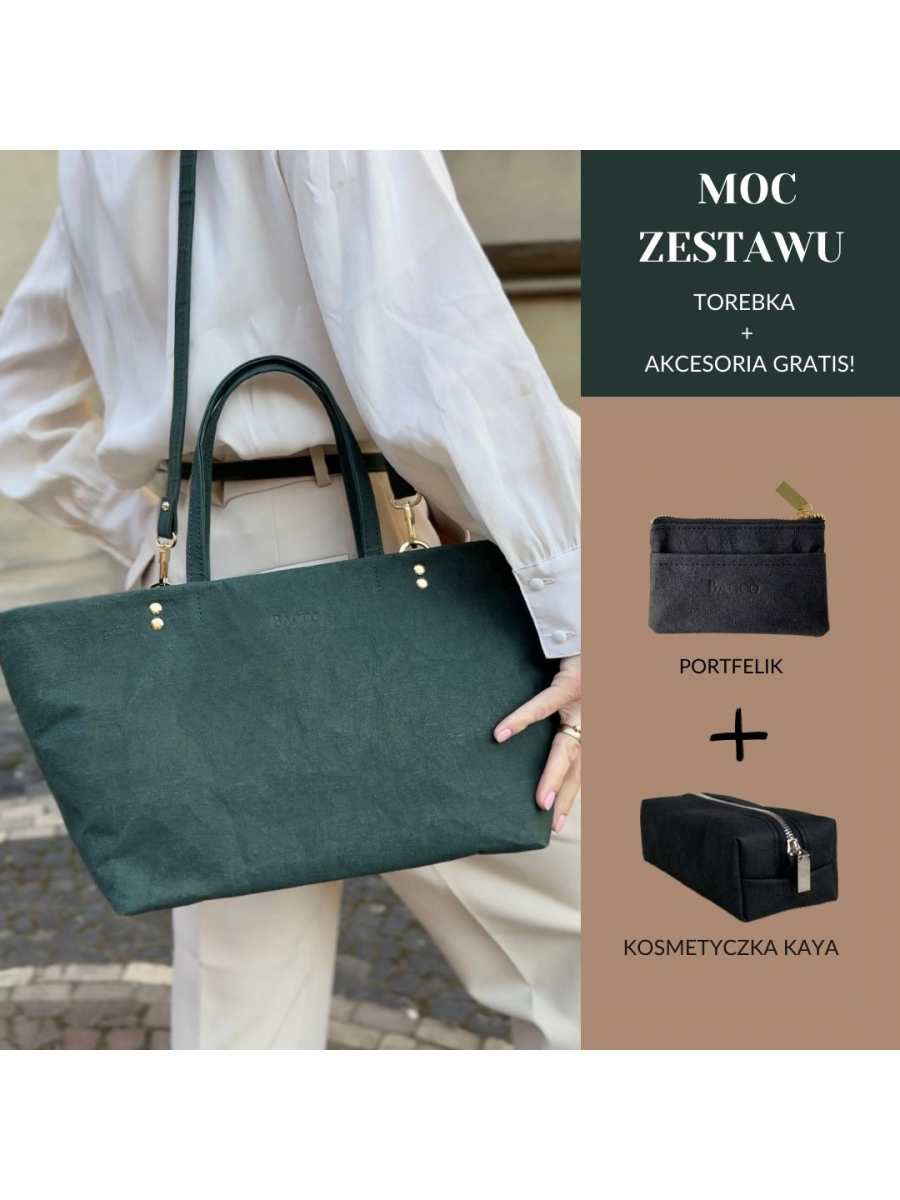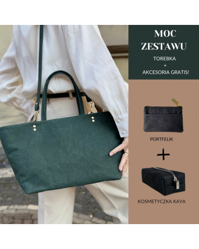 Zestaw 3w1: Shopperka Giulia, kosmetyczka i portfelik w cenie torebki - zielona butelka - złote okucia